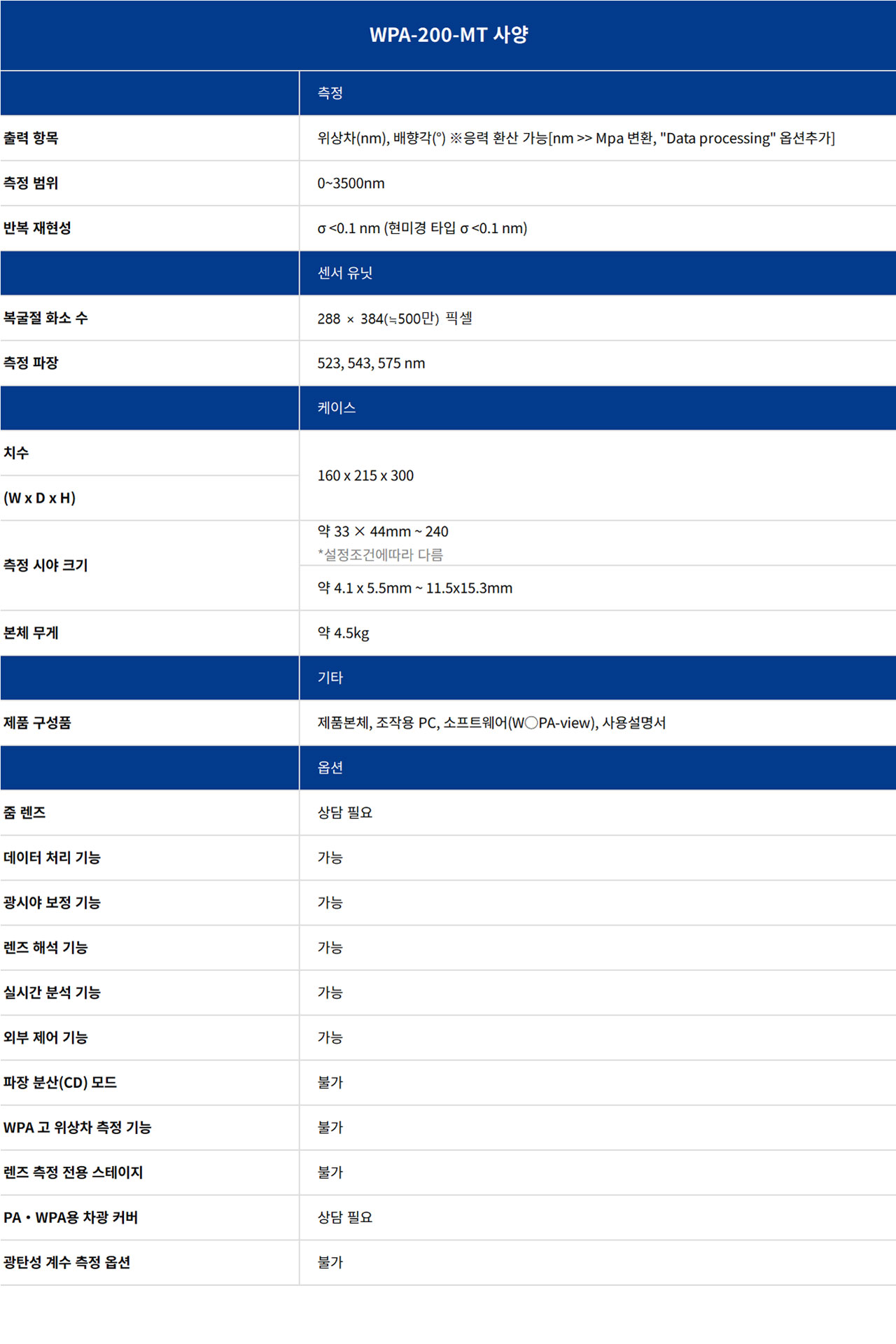 복굴절/위상차의 분포를 3파장으로 측정함으로써 위상차의 측정 레인지를 0~3500nm로 확대한 시리즈입니다.